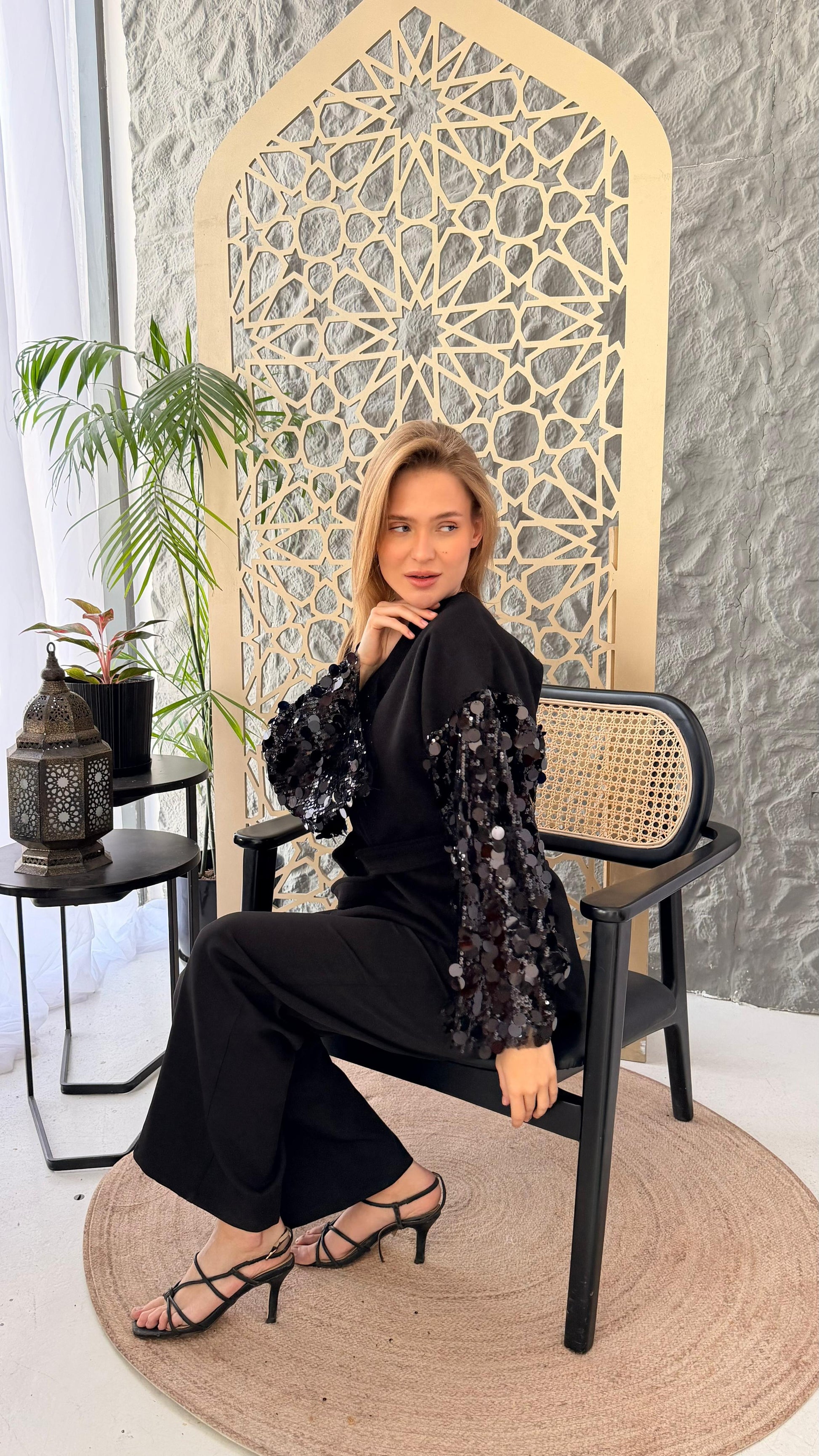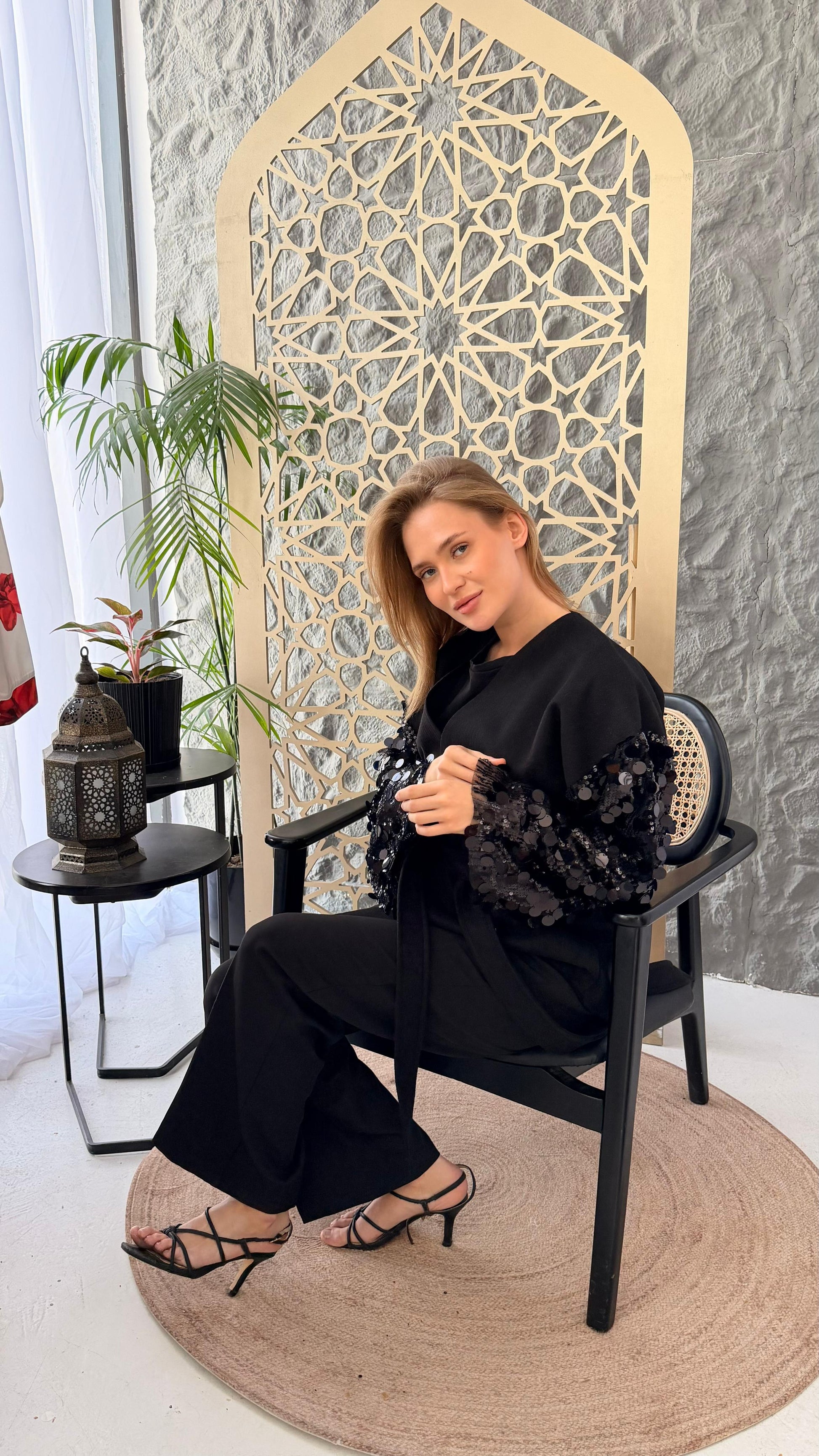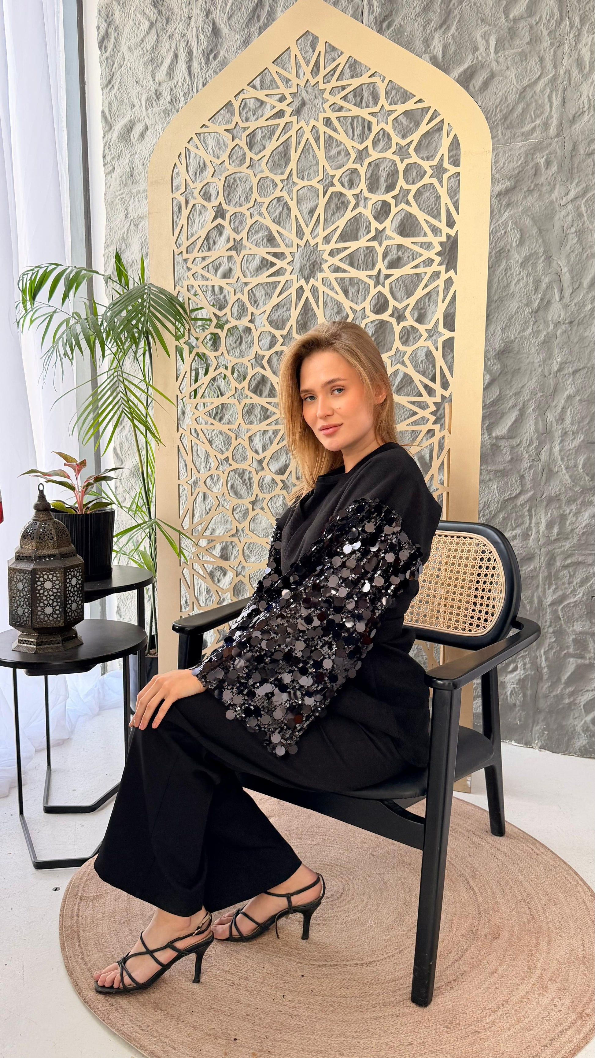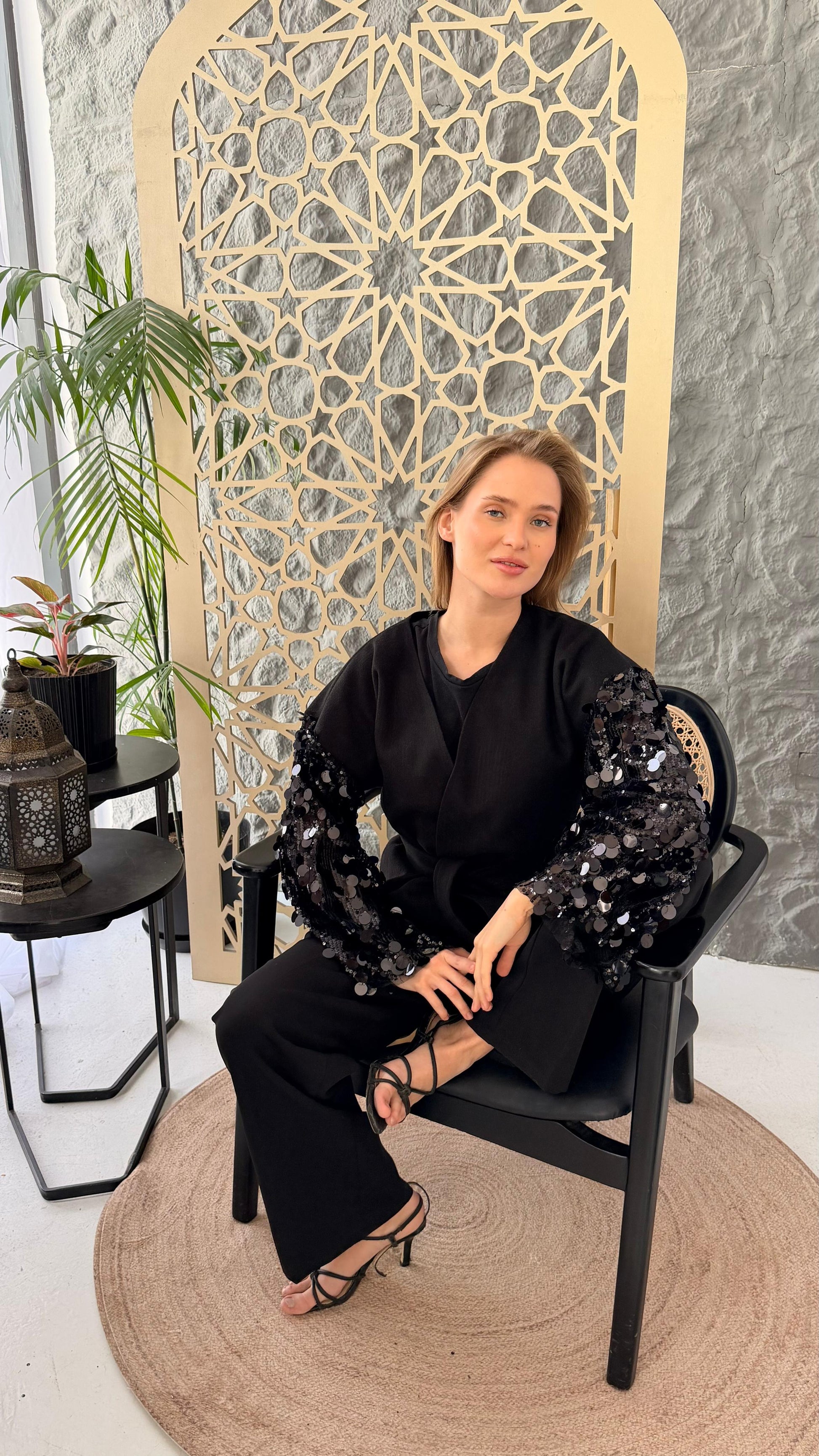 Crafted from premium fabric, this elegant piece offers warmth with a structured, refined look. Delicate pearl embellishments on the sleeves add a soft luminous touch, making it perfect for both daytime elegance and evening sophistication.